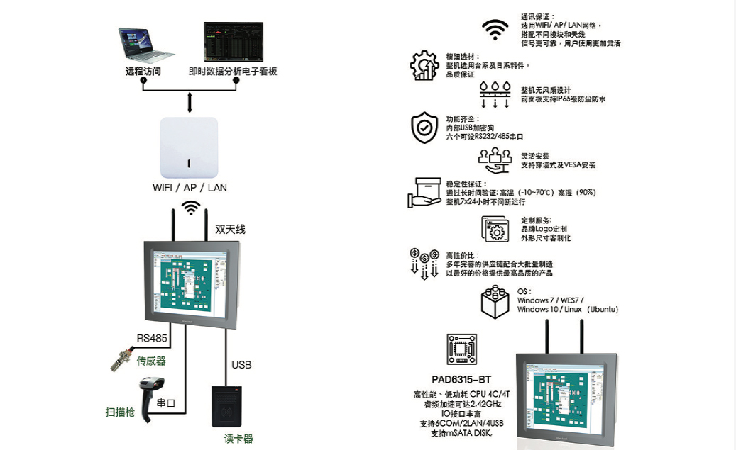 浩騰智能工業(yè)平板電腦系列,能夠在嚴苛環(huán)境下長時間穩(wěn)定運行,雙天線保證在終端現(xiàn)場的持續(xù)數(shù)據(jù)傳輸不掉線。能夠應(yīng)用現(xiàn)場遠端訪問使用或生產(chǎn)情形即時分析等調(diào)整客戶需求之設(shè)定。搭配不同模塊,在不論是WIFI/ AP/ LAN 的生產(chǎn)環(huán)境都能有優(yōu)秀的表現(xiàn)。經(jīng)過長時間微波暗室測試,優(yōu)秀的傳輸表現(xiàn),是MES系統(tǒng)的高效能運行的保證。